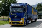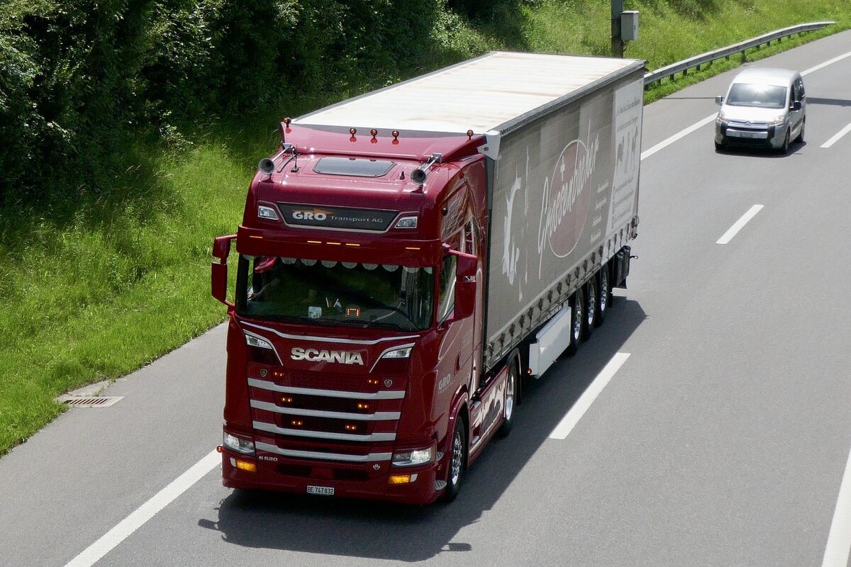 Ein Scania Sattelzug von GRO Transport (vormals Regro) am 28.6.24 auf dem Weg zum Trucker Festival auf der A8 in Matten b. Interlaken.