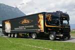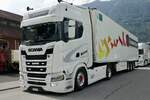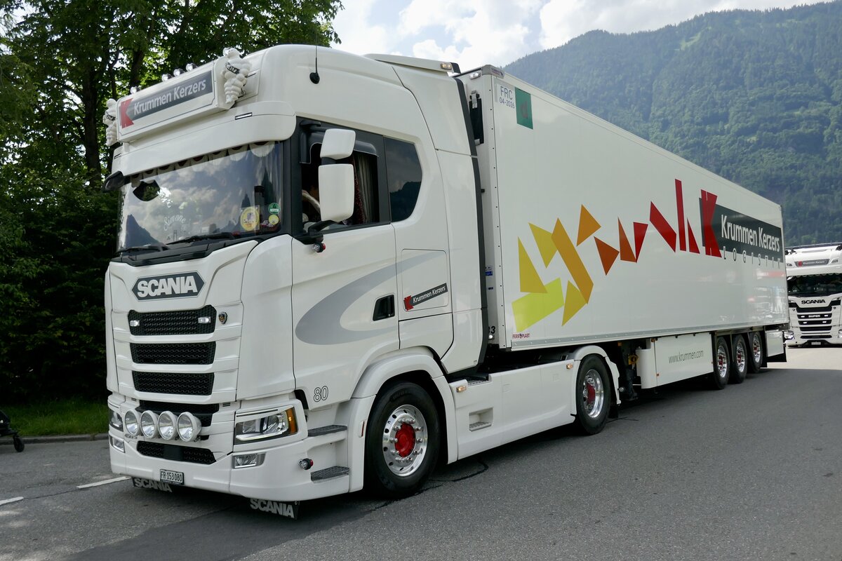 Ein Scania Sattelzug von Krummen Kerzers der am 28.6.24 auf die Einfahrt aufs Trucker Festival Gelände wartet in Bönigen.
