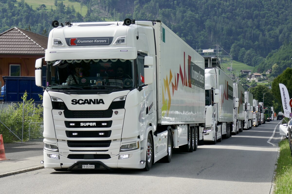 Ein Scania Sattelzug mit weiteren LKW von Krummen Kerzers die am 28.6.24 in Bönigen auf Weiterfahrt zum Trucker Fwstival Gelände warten.