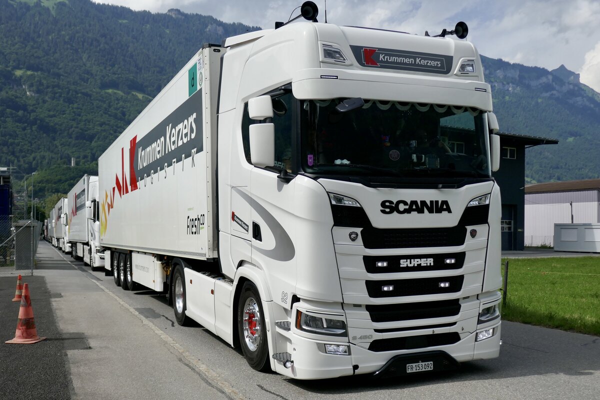 Ein Scania Sattelzug von Krummen Kerzers der am 28.6.24 zum Trucker Festival unterwegs ist in Bönigen.