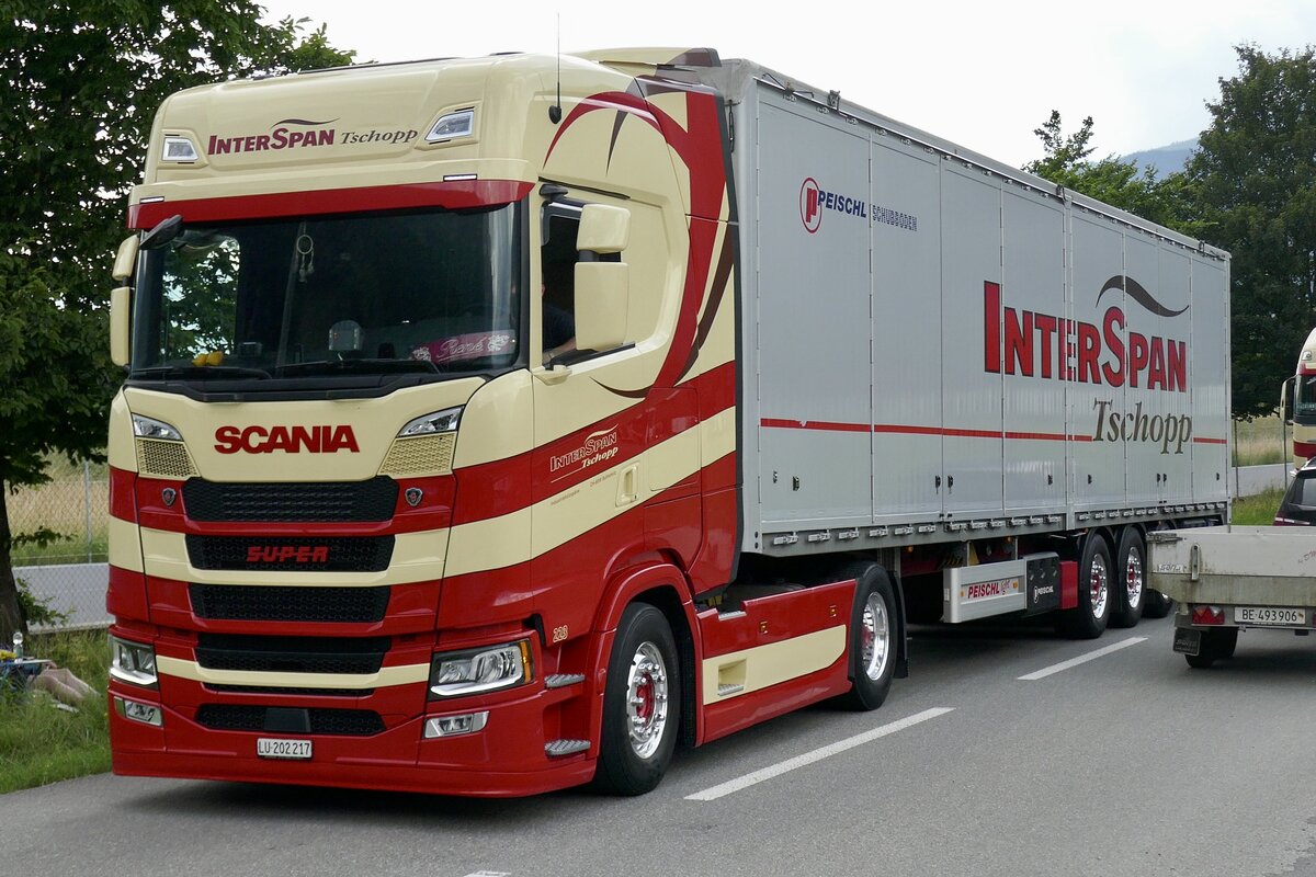 Ein Scania Sattelzug von Interspan der am 28.6.24 kurz vor dem Trucker Festival steht in Bönigen.