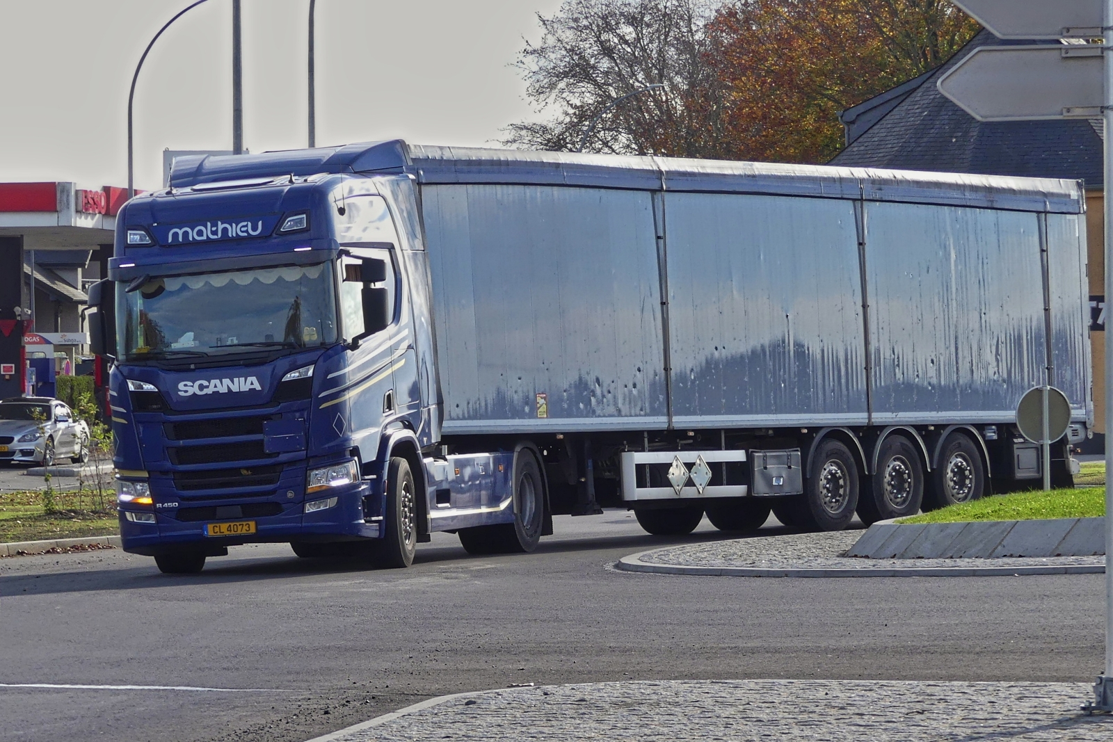 Scania R 450, Sattelzug beider Durchfahrt des Kreisverkehrs auf der Féitsch. 10.2024
