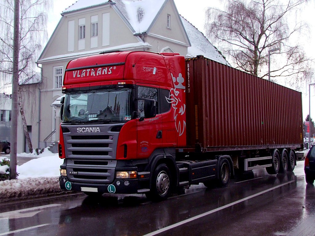 SCANIA R420 transportiert einen entleerten 40Fuß-Container von einem Baumarkt ab;101220