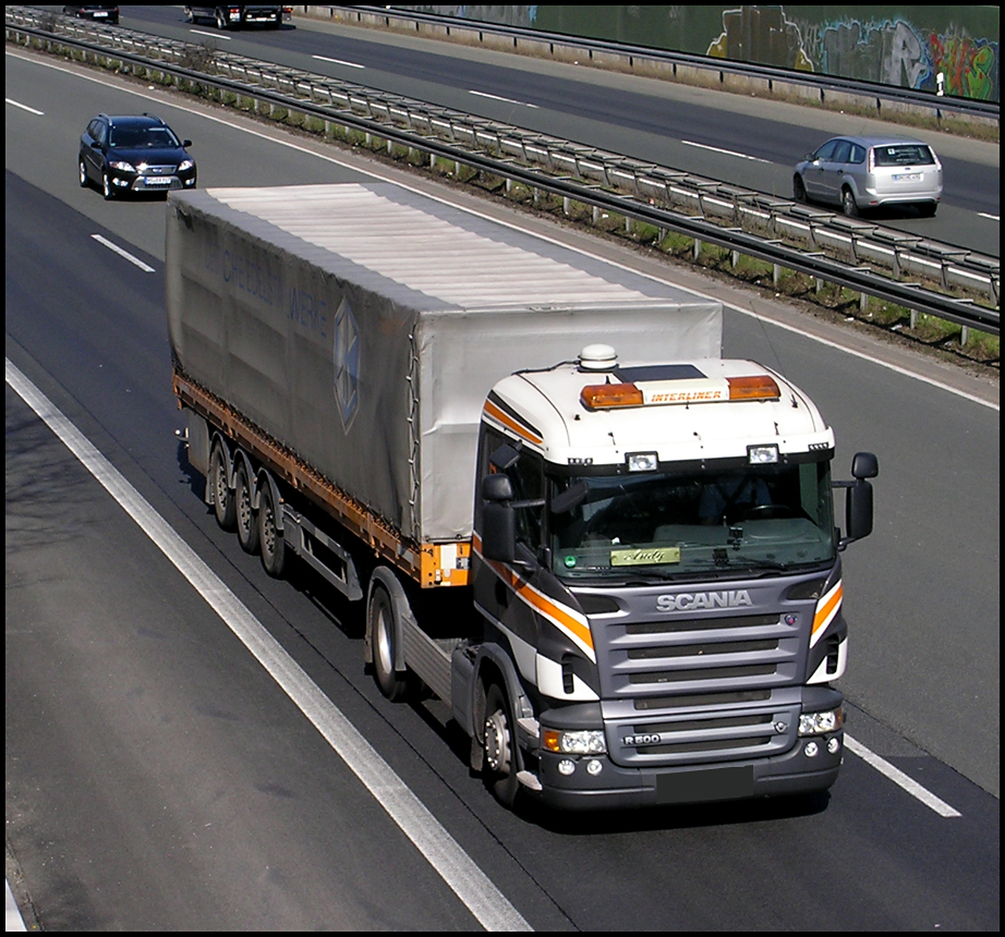 29.03.2011: ..der Märzsonne entgegen fährt der Scania V 8 R 500 Sattelzug auf der Sauerlandlinie..