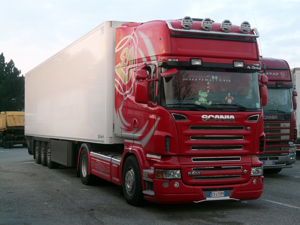 Scania R500 mit Kühlauflieger aus Italien auf einem Parkplatz bei Ulm, 18.03.2012