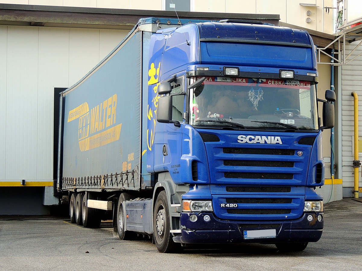 SCANIA-R420, hat seinen WALTER-Auflieger bei einer Laderampe angedockt; 130725