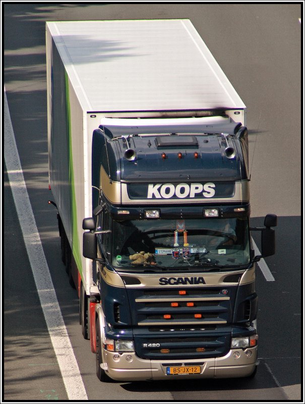 SCANIA R420 der Niederländischen Spedition KOOPS bezwingt bei Lüdenscheid den Homert-Anstieg Richtung Süden. (09.08.2008)