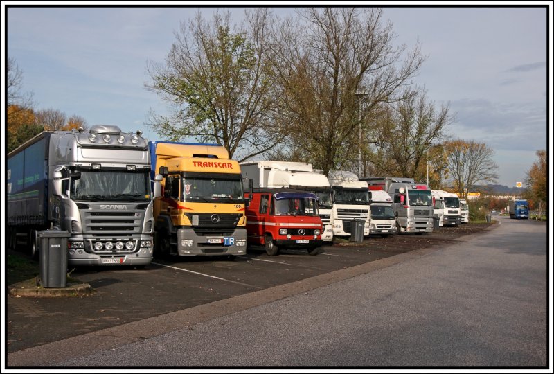 Ein Anblick der sich jedes Wochenende wiederholt. Am Wochenende sind die Stellplätze größtenteils von Lkw´s aus Ost- und Südosteuropa belegt. (v.l.n.r.) SCANIA R500 V8 aus Hamburg, Axor 1840 der rumänischen Spedition Transcar, die beiden DAF´s und der Mitsubischi Kleinlaster kommen aus Polen. (02.11.2008)