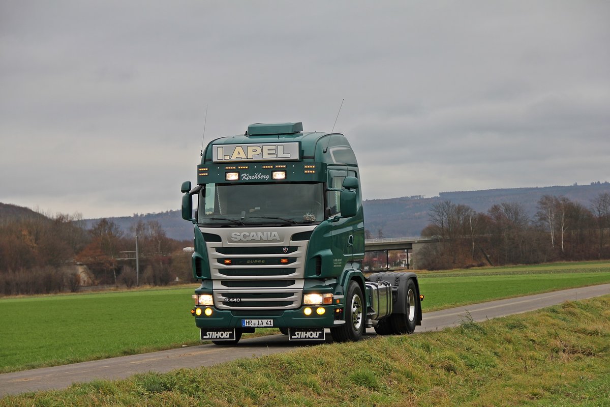 Scania R440 Highline Sattelzugmaschine auf einem Feldweg bei Kaufungen. 27.11.2011
