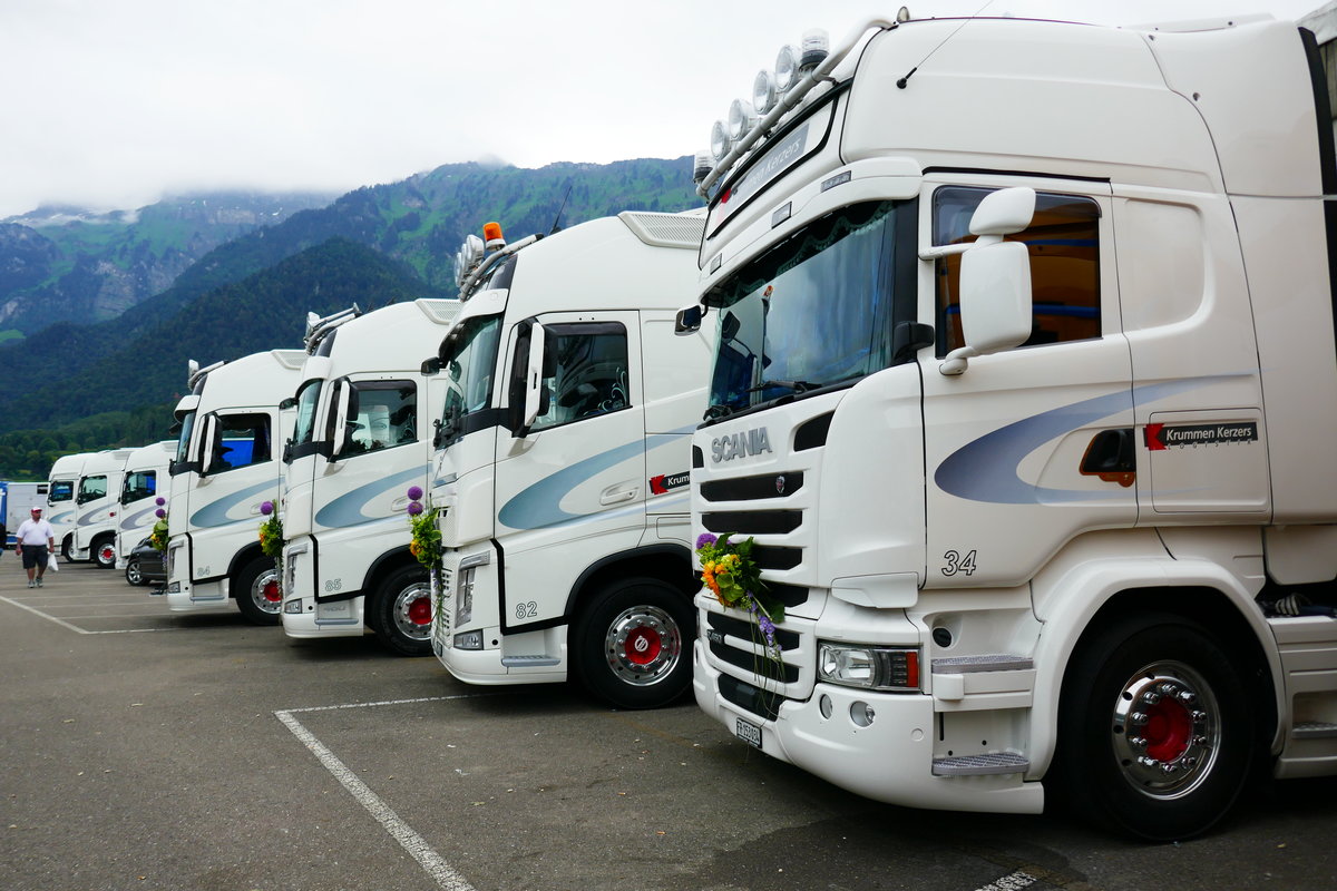 Scania und Volvos von Krummen Kerzers am 26.6.16 beim Trucker Festival Interlaken.