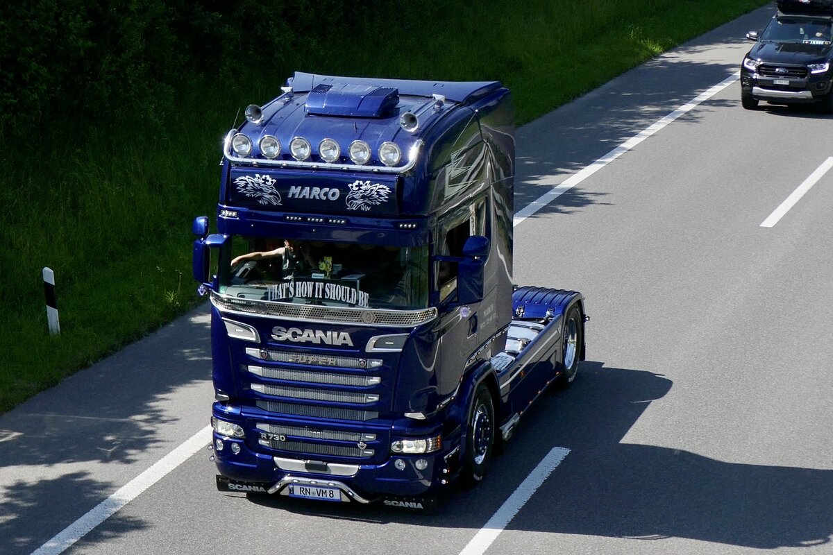 Eine Scania R 730 Zugmaschine auf dem Weg Zum Trucker Festival am 28.6.24 auf der A8 in Matten b. Interlaken.