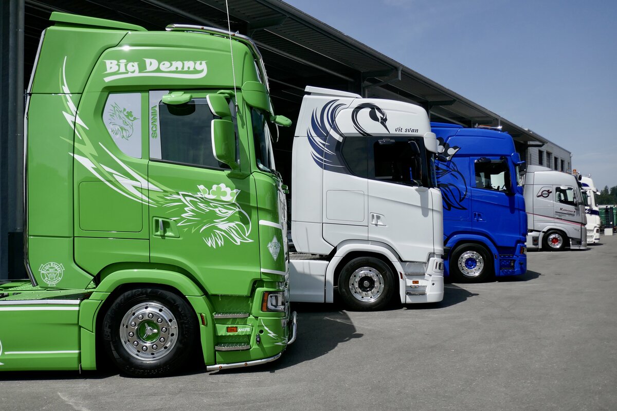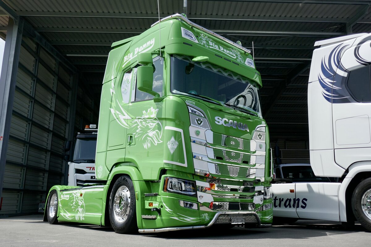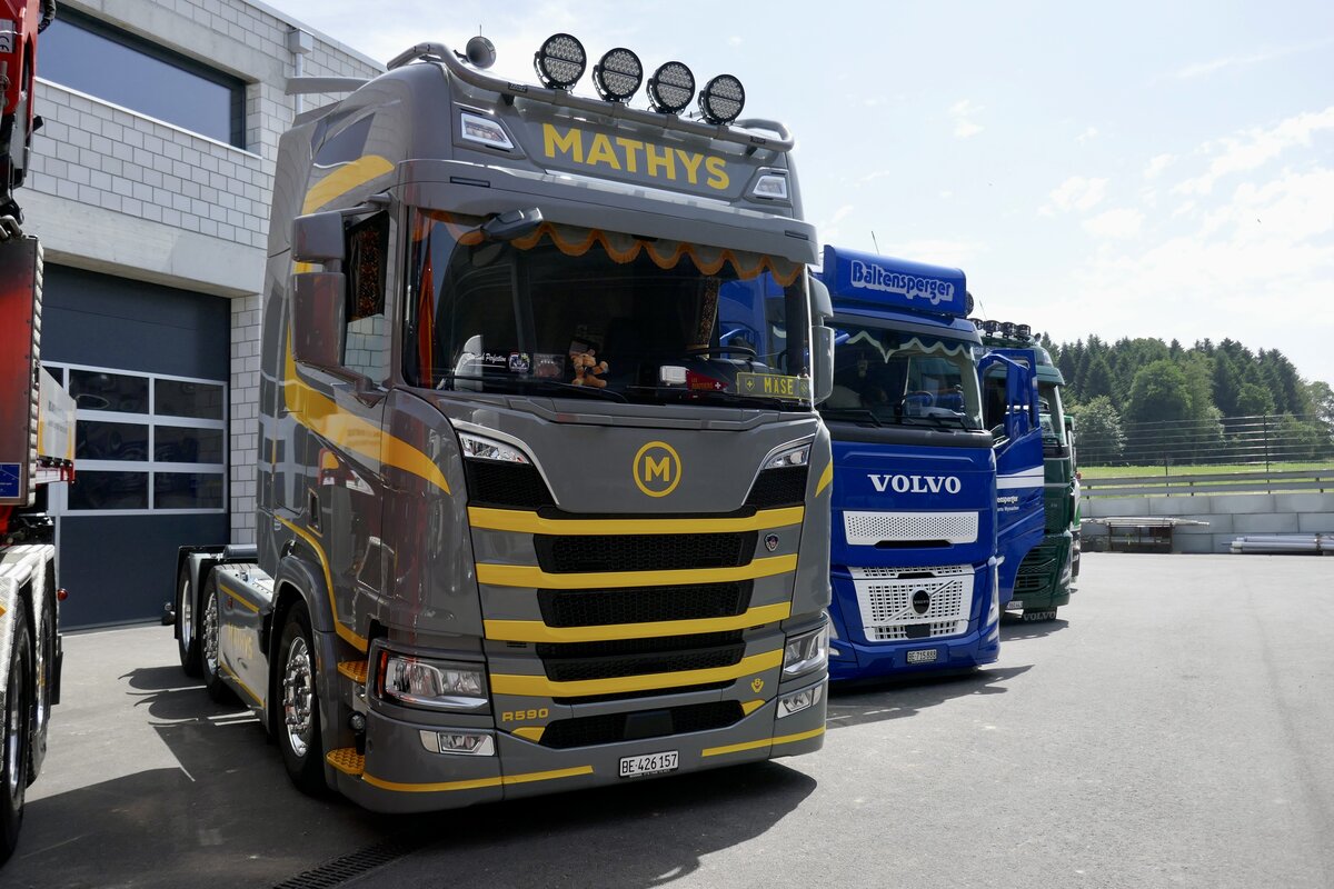 Eine Scania Zugmaschine und ein Renault von Senn die am 14.7.24 beim Trucker Treffen in Ambri stehen.