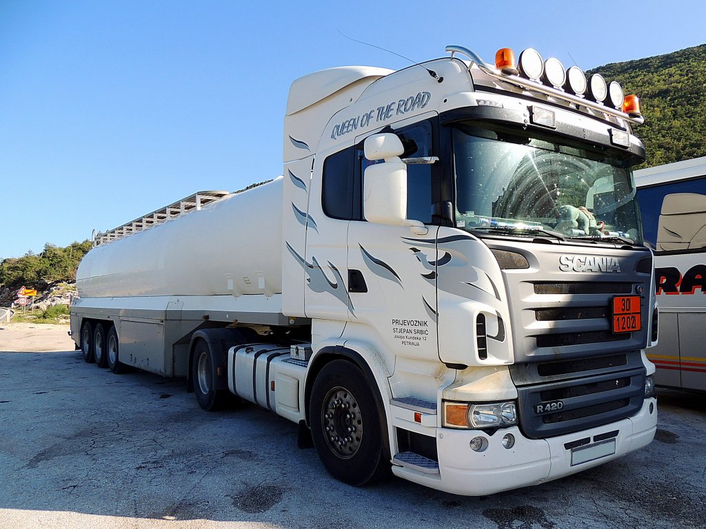 SCANIA R420(Queen of the road)hat lt. Gefahrentafel im mitgeführten Auflieger Heizöl/Diesel geladen, und absolviert an der Raststätte bei Neum eine Pause; 130425