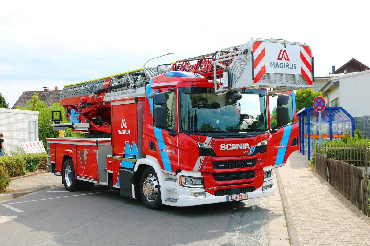 Magirus/Scania Vorführdrehleiter am 09.07.22 beim Kreisfeuerwehrtag der Feuerwehr Münster