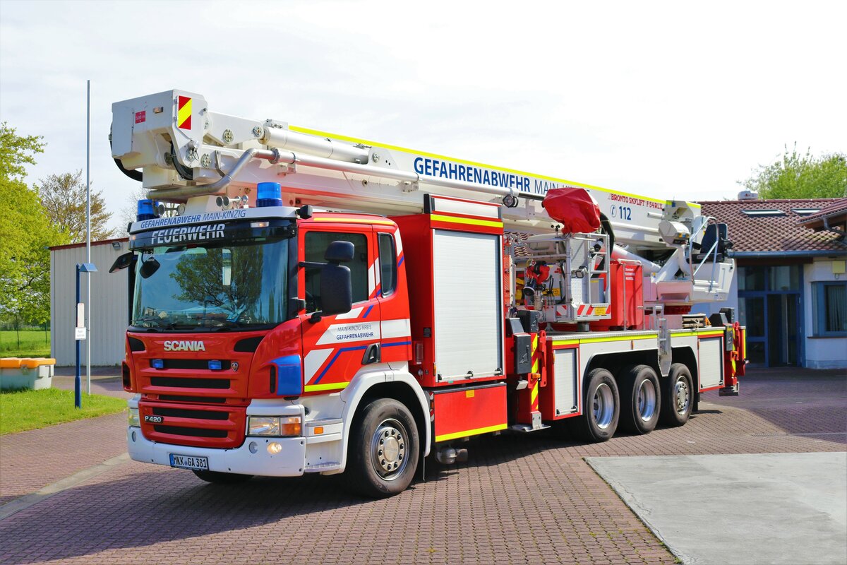 Main Kinzig Kreis Scania P420 mit Bronto Skylift F54 RLX (Florian Main Kinzig 19-38-1) Teleskopgelenkmast am 22.04.23 in Maintal Hochstadt bei einem Fototermin