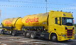 Deutsche Tiernahrung Cremer GmbH & Co. KG mit einem Scania R450 Siloaufbau-LKW + Hänger (für Tierfutter Marke Deuka) am 27.09.23 Höhe Bahnübergang Bahnhof Rodleben.