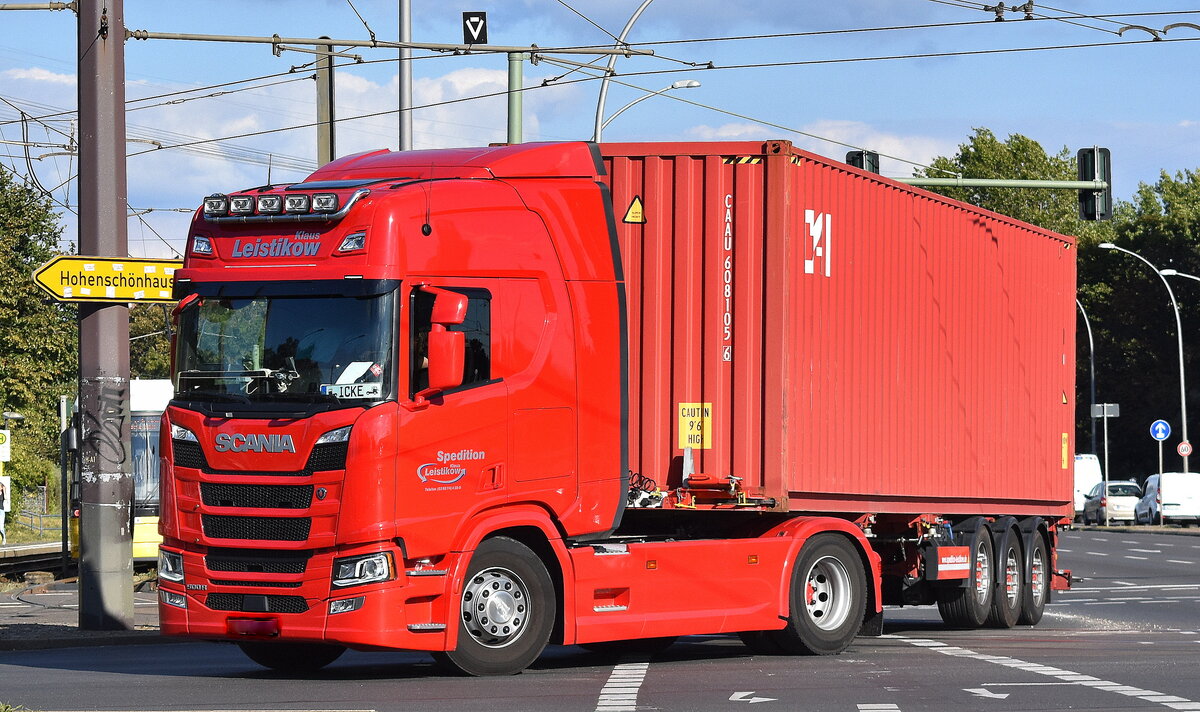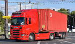 Richard Heinbokel & Co. GmbH aus Rostock mit einem Containerträger Sattelzug (Tankcontainer mit UN-Nr. 3265 = Ätzender, saurer, organischer, flüssiger Stoff, N.A.G.) und SCANIA R 500 Zugmaschine am 21.09.23 Höhe Bahnübergang Bahnhof Rodleben.