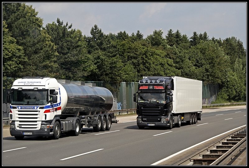 Was ist wenn sich zwei Scania Bergauf überholen? Na kampf der Giganten;-): Scania R420 von Ohrem Transporte (Milchtransporte, Milchsammel- und Schüttguttransporte) wird von einem SCANIA TOPLINE R500 \8/ von BÜHN TRANS aus Schonstett beim AK Hagen überhollt. BÜHN TRANS ist seit ca. 10 Jahren in Europa unterwegs und setzt Zugmaschinen von VOLVO und SCANIA ein. Eine schöne Aussage von der Hompage der Firma: "Nicht zum angeben, sondern um Ausfälle zu vermeiden und Pünktlichkeit und Zufallässigkeit als normal anzusehen sind alle Fahrzeuge mit: - GENÜGEND PS, allen wichtigen Kommunikationsgeräten und vielem Komfort für ausgeruhte und motivierte Fahrer"