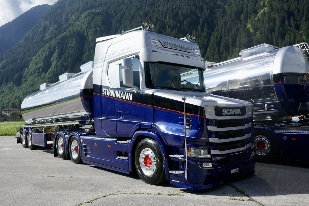 Ein Scania ST 770 Tanksattelzug von Stirnimann der am 14.7.24 beim Trucker Treffen auf dem Flugplatz in Ambri steht.