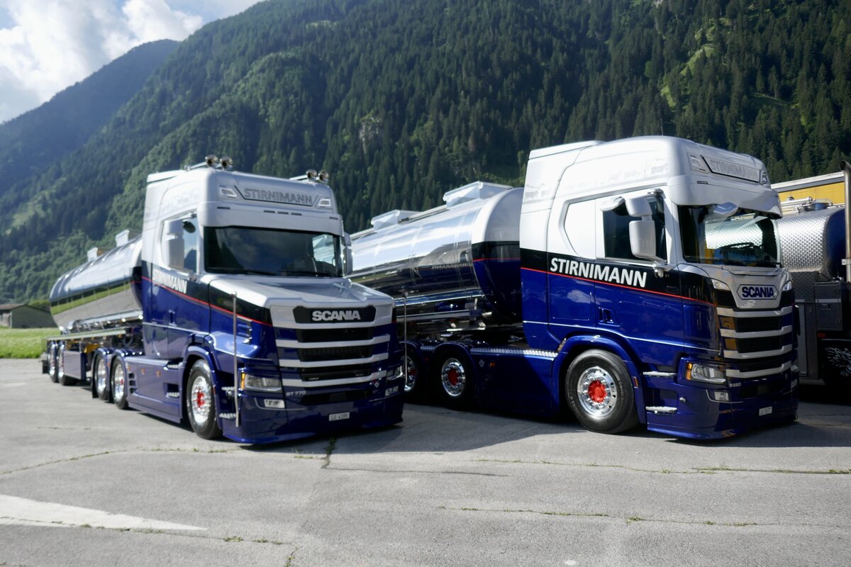 Zwei Scania Tankzüge von Stirnimann die am 14.7.24 beim Trucker Treffen in Ambri stehen.