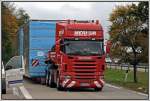 SCANIA R500 \8/ des Schwertransportunternehmen MERKUR aus Sonsbeck/Niederrhein bei Xanten. Aufgenommen am Mittag des 15.10.2008.
