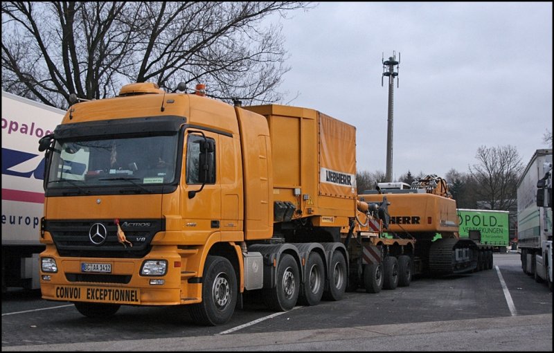 Actros V8 4160 ist für LIEBHERR unterwegs und hat einen Raupenbagger R954C Litronic dabei. Hier wartet der Transport auf die kommende Nacht um die Fahrt Fortsetzen zukönnen. (03.02.2009)