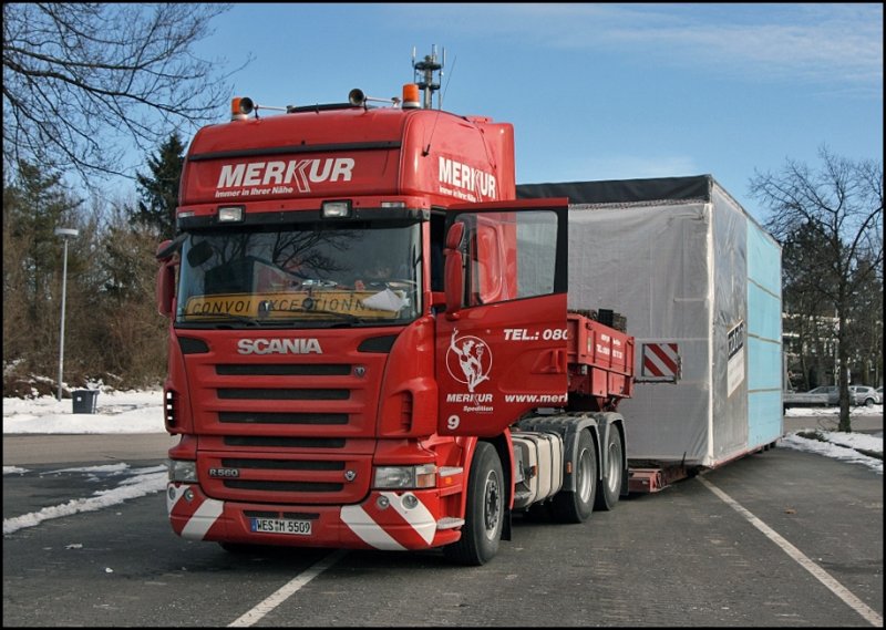 Etwas abseits steht dieser Scania R560 \8/ von Merkur auf dem Rasthof Sauerland-Ost. Hinter der Windschutzscheibe hängt eine "Convoi Exceptionnel" Hinweistafel. Das Schild muss angebracht werden wenn der Transport Überbreite oder schwerer ist als herkömmliche Transporte. Cadolto ist weltweit der führende Spezialist für die Erstellung von Gebäuden in modularer Bauweise. (18.02.2009)