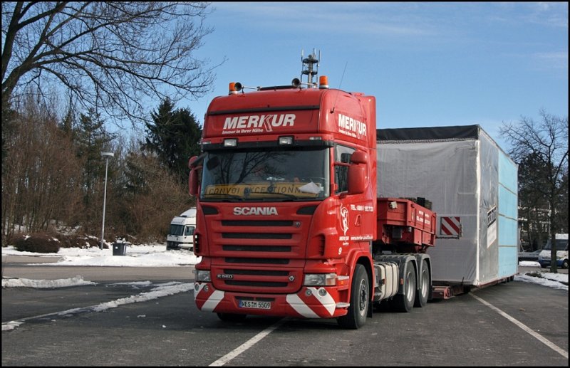 Im Sonnenlicht des 18.02.2009 wartet dieser SCANIA R560 \8/ der Spedition MERKUR auf die bevorstehende Nacht.