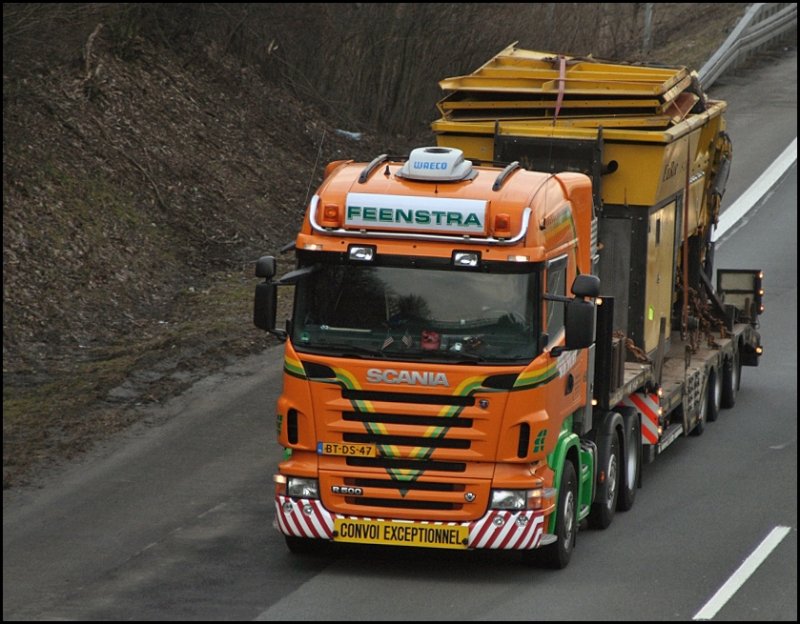 SCANIA R500 \8/ des niederländischen Schwerlastunternehmen FEENSTRA/Holtrop Van der Vlist Transportgroup ist durch das Sauerland in Richtung Süden unterwegs. Was für ein Gerät? (02.03.2009)
