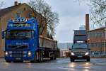 Schwertransport Begleitfahrzeug und Schwertransporter warten auf das zweite beladene Fahrzeug, mit einem Betonschwimmsteg der Marina Systeme GmbH. - 04.12.2012