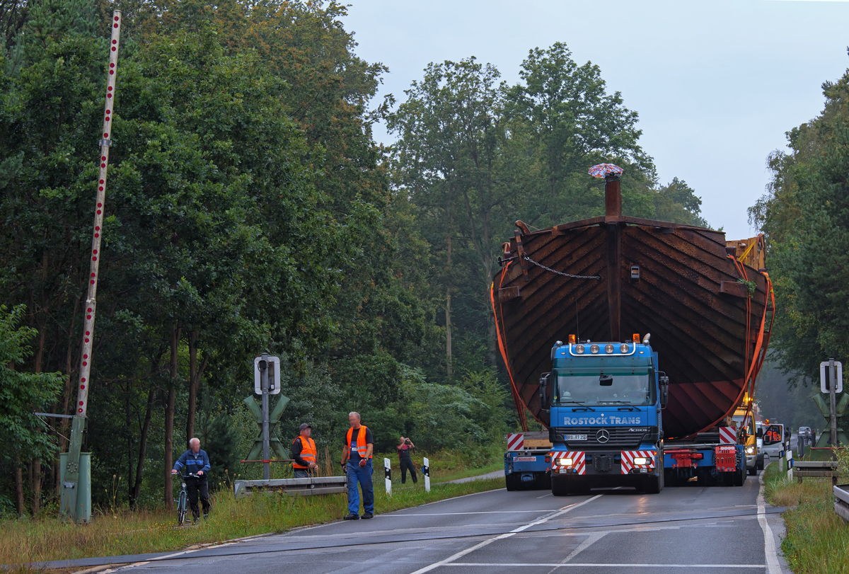 MB ACTROS Schwertransport mit dem Nachbau einer Kogge vor dem BÜ in Gumnitz.