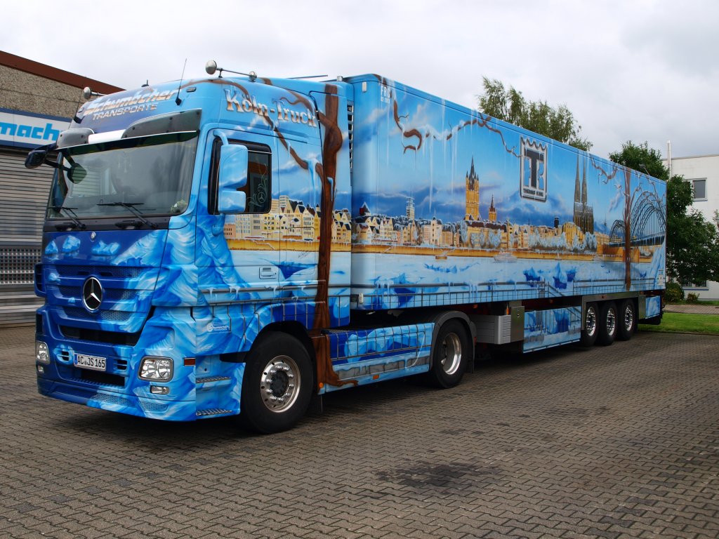 Der KÖLN-TRUCK, ein Actros 1844 der Spedition Schumacher aus Würselen bei Aachen. Das Airbrush Kunstwerk zeigt einen Blick von der "scheel Sick",(der rechten Rheinseite) über den Rhein auf den Dom und der Hohenzollernbrücke. Auf der Fahrerseite ist Köln im Winter zu sehen. Diesen Kühlzug gab es von Herpa auch als Modell im Maßstab 1:87. Bild vom 27.08.2010.