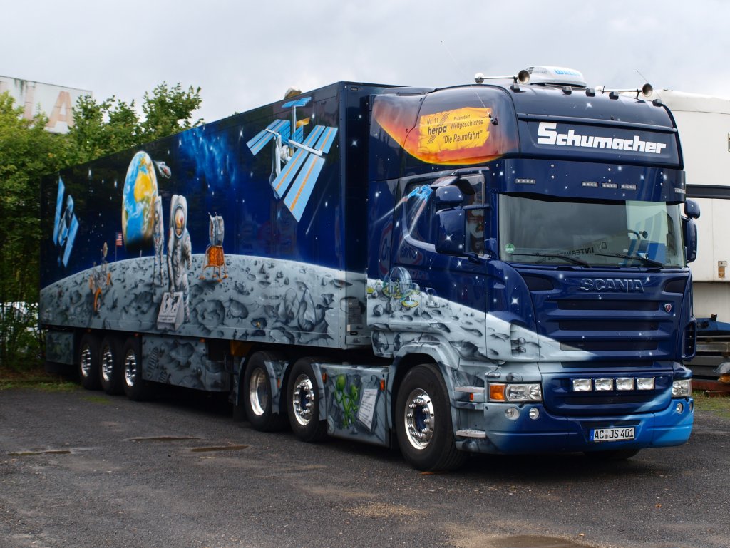 3achser Scania Zugmaschine mit Kühlauflieger DIE RAUMFARHT der Spedition Schumacher aus Würselen. Diesen Kühlzug gab es von Herpa auch als Modell im Maßstab 1:87. Bild vom 27.08.2010.
