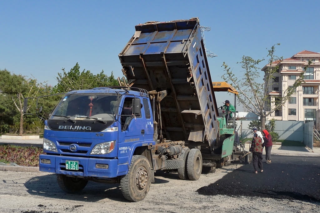 ... und füllt den Rest seiner Ladung in den Asphaltfertiger.