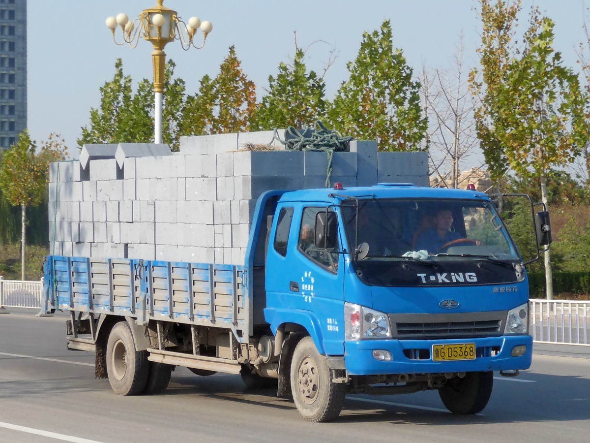 T-KING (Shandong Tangjun Ouling Automobile Manufacture Co.) Kleinlaster mit einer Ladung Steinen; Ladungssicherung ist dort für viele LKW-Fahrer ein unverständliches Fremdwort...