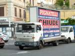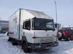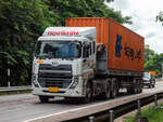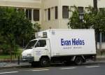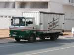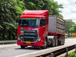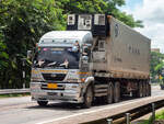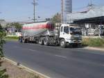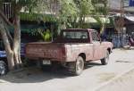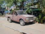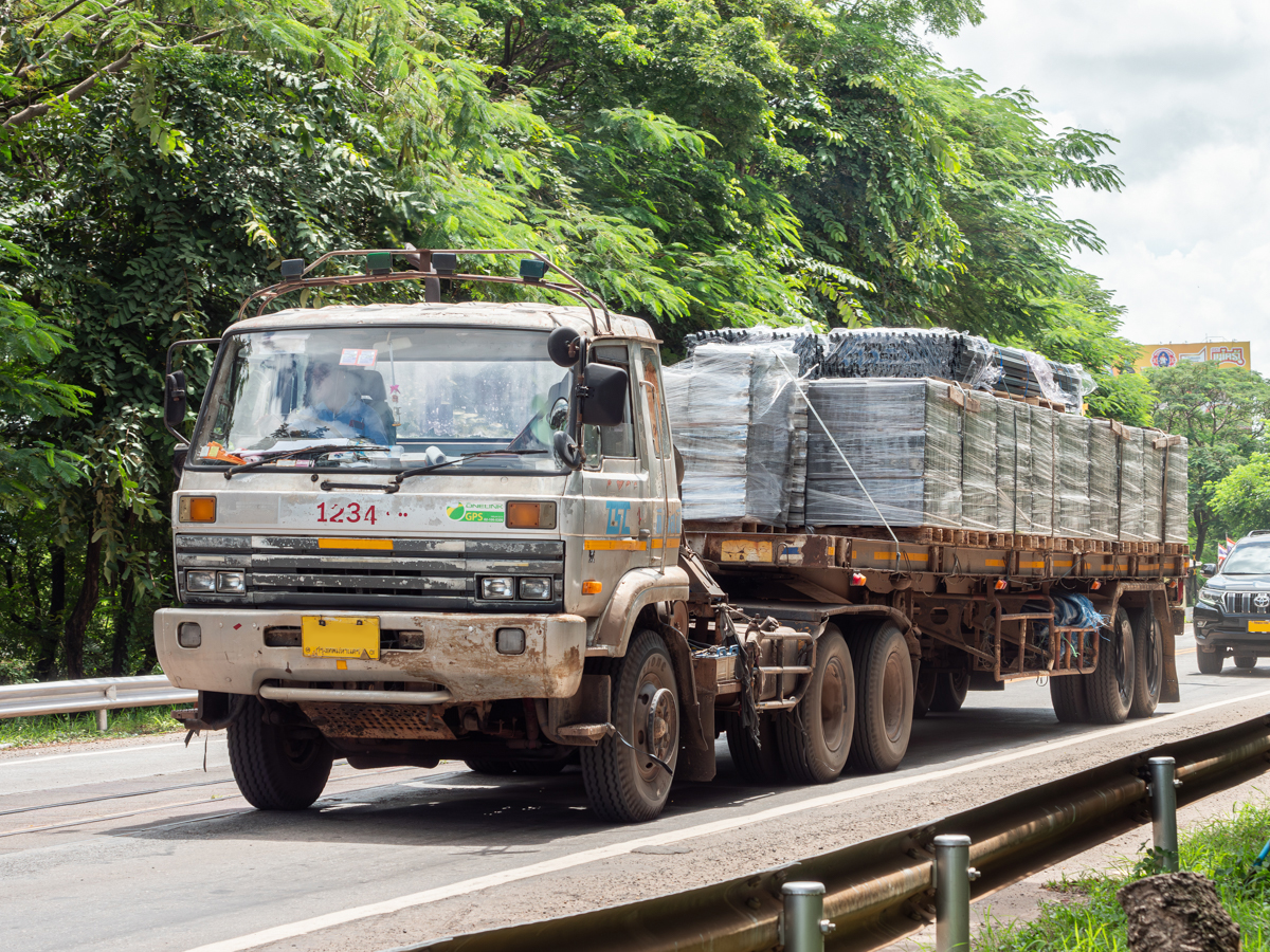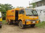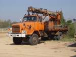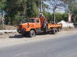Dieser NISSAN DIESEL LKW wartet auf seinen Einsatz beim Umsetzen von Betonmasten für Elektro- und Telefonkabel am 04.02.2011 im Nordosten Thailands