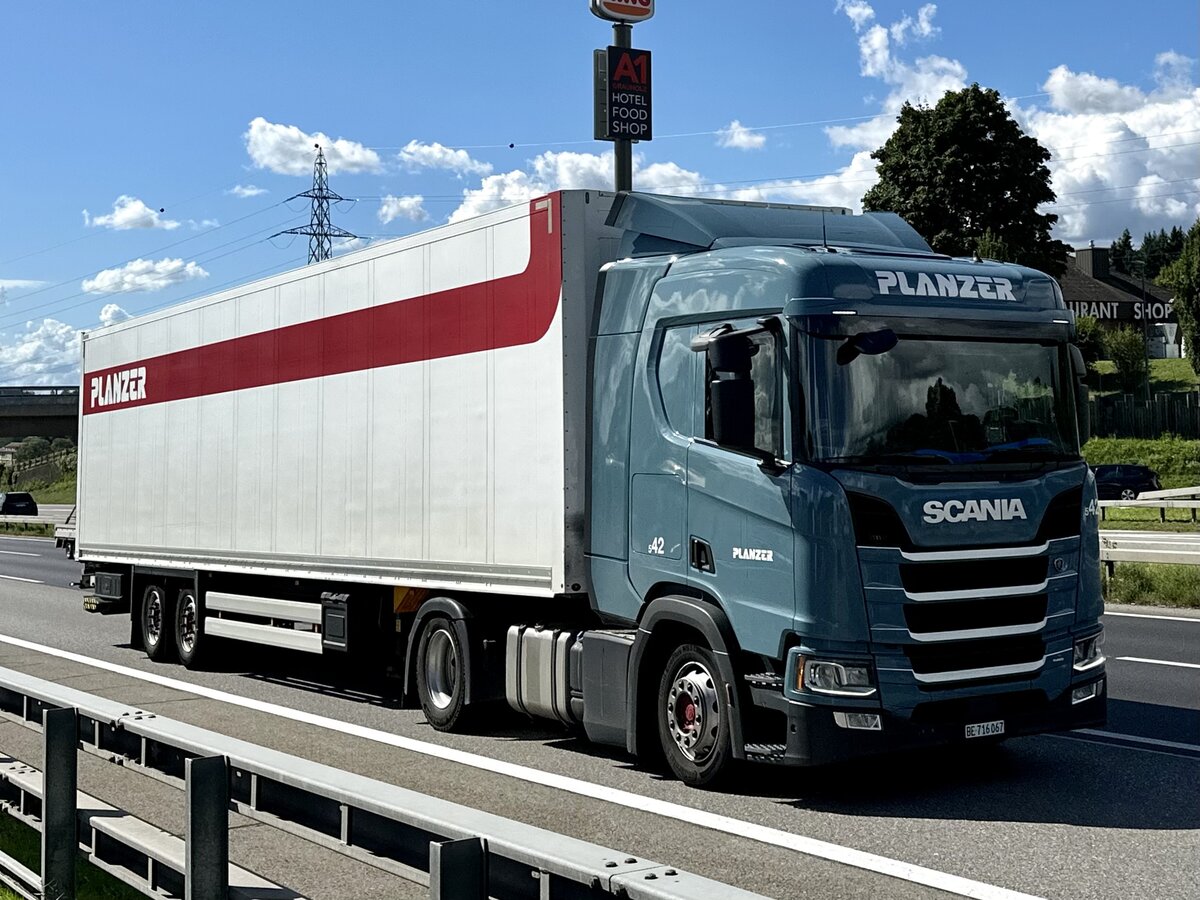 Volvo Hängerzug von Planzer mit zwei weiteren am 28.6.24 auf dem Weg zum Trucker Festival auf der A8 in Matten b. Interlaken.