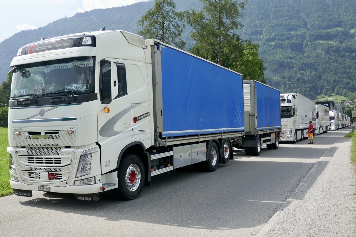 Ein Volvo FH Hängerzug und weitere LKW von Krummen Kerzers die am 28.6.24 auf Einlass aufs Trucker Festival Gelände warten in Bönigen.