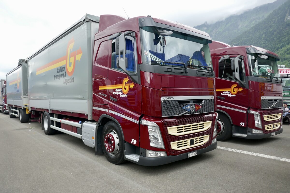 Zwei Volvo Hängerzüge von Galliker die am 30.6.24 beim Trucker Festival in Interlaken stehen.