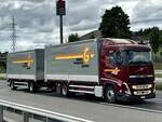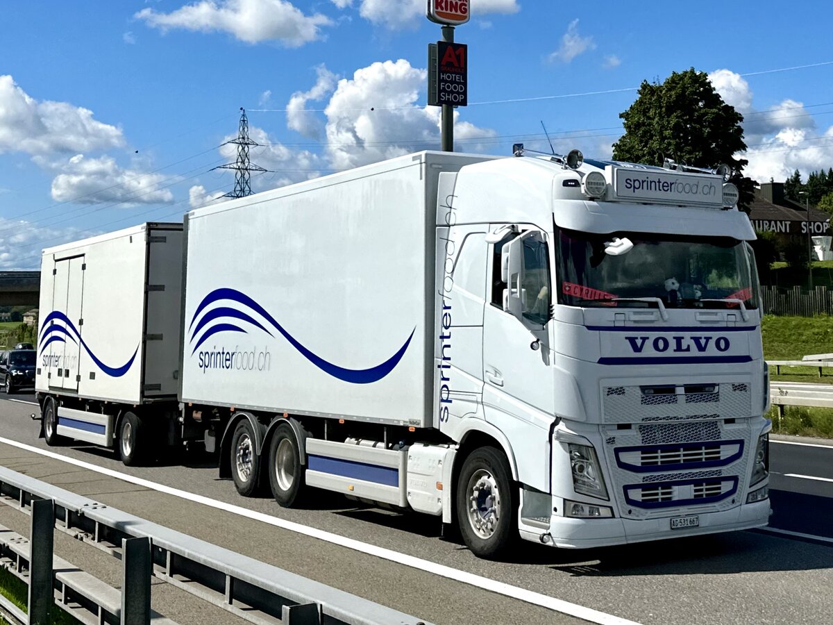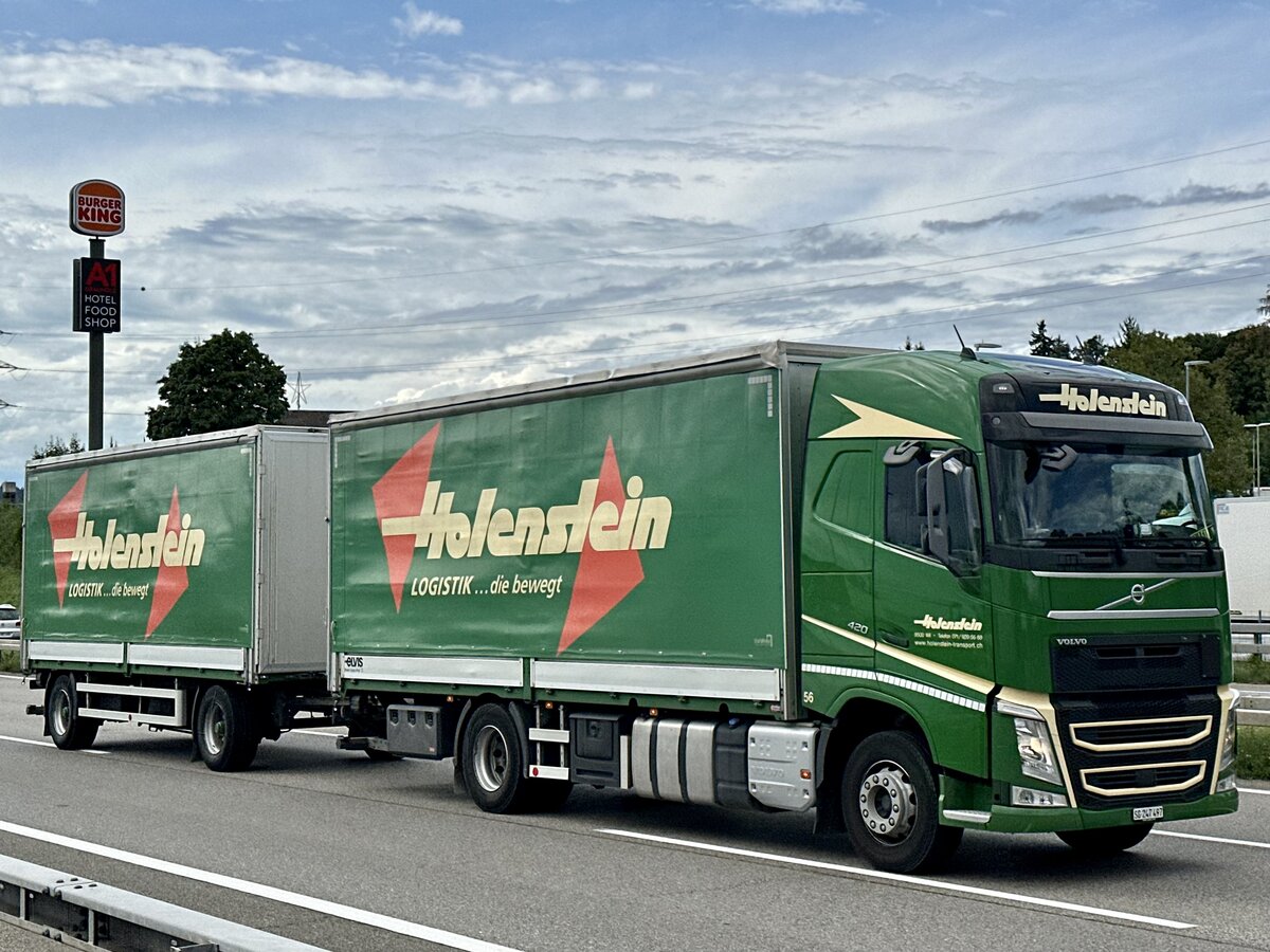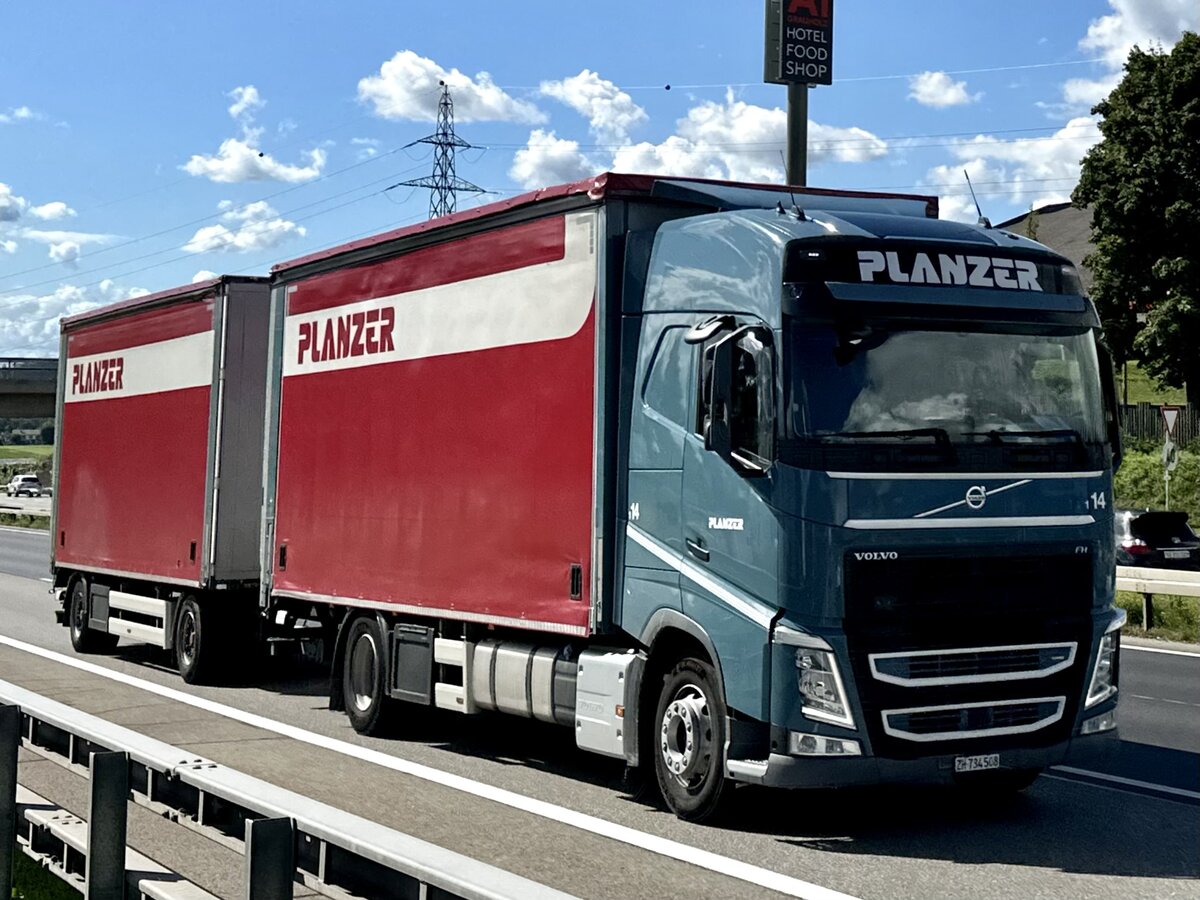 Drie Volvo FH und ein Scania von Planzer die am 14.7.24 beim Trucker Treffen in Ambri stehen.