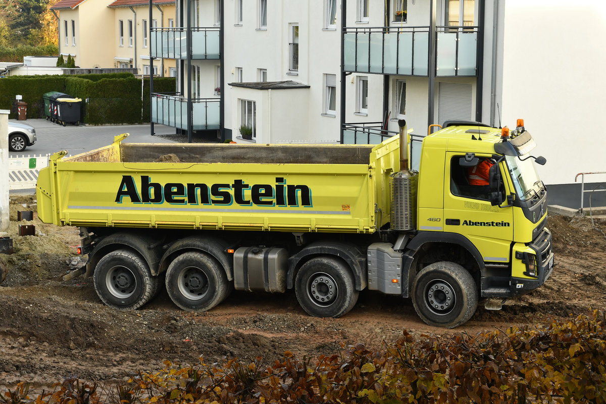 Radlader HYDREMA, von Beton Weber, hebt an einer Straße einen Graben aus, der Aushub wird auf einem Volvo Kipper abgelegt. 12.2025 De Rond Hans und Jeanny