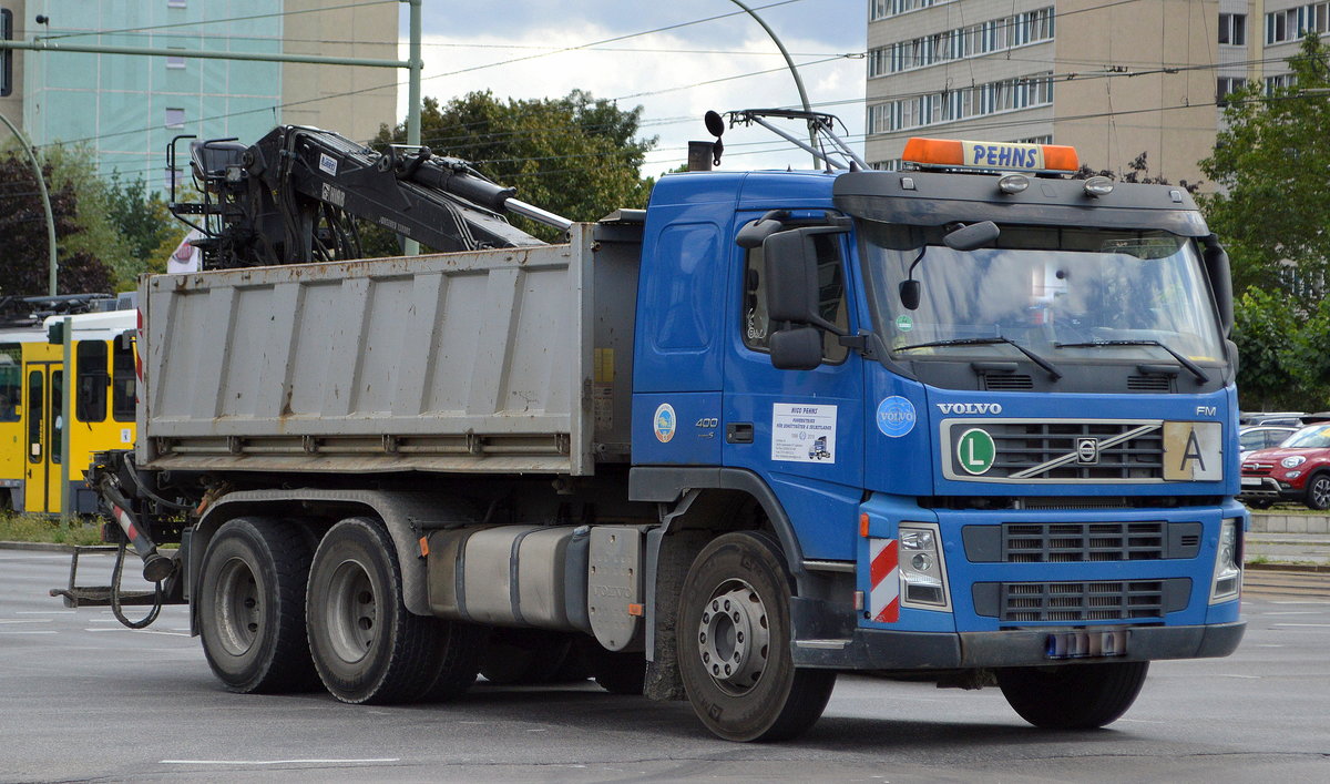 Ein VOLVO FM 400 Kipper mit Greifer (Selbstlader) vom Fuhrbetrieb NICO PEHNS am 13.08.19 Berlin Marzahn.