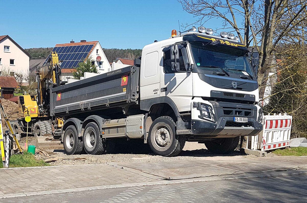 =Volvo 480-Kipper von RÖLL-Bau steht auf einer Baustelle in Petersberg-Marbach im April 2023