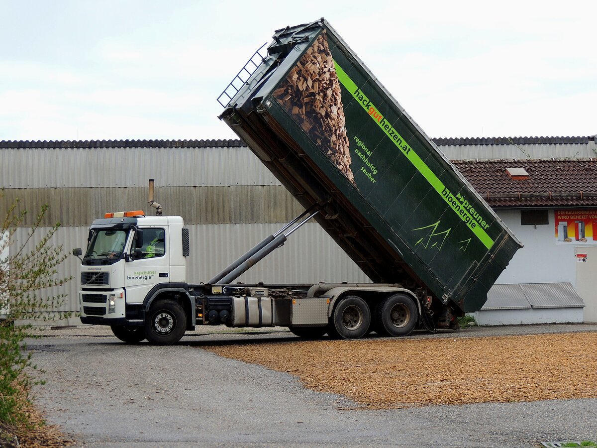 VOLVO liefert im kippbaren Auflieger nachhaltiges Hackgut bei einer Großheizung an; 240404
