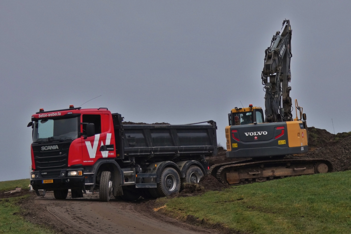 Herbstzeit ist Erntezeit. Hier wird mit einer Ropa L8.220 "Lademaus", einer selbstfahrenden Arbeitsmaschine zum Reinigen und Verladen von über 550 to Zuckerrüben pro Stunde, eine Miete am Feldrand auf LKW verladen. Der Volvo FM12 Hängerzug ist in wenigen Minuten randvoll geladen. Überladen des LKW ist bei der Lademaus nicht möglich, sie hat eine Waage mit der die verladene Menge Rüben erfasst wird.