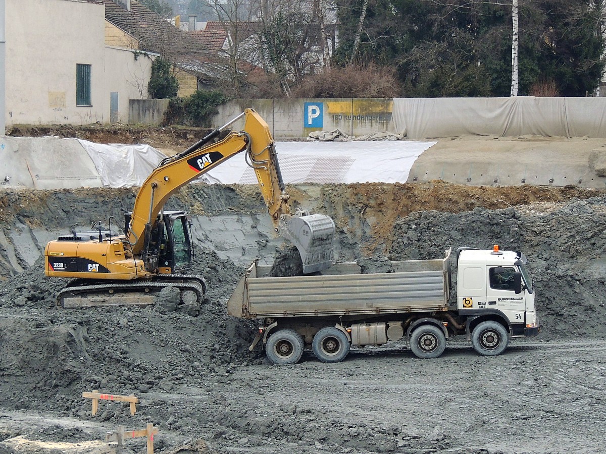 VOLVO-420 wird von Caterpillar 323D mit Erdaushubmaterial beladen; 131220