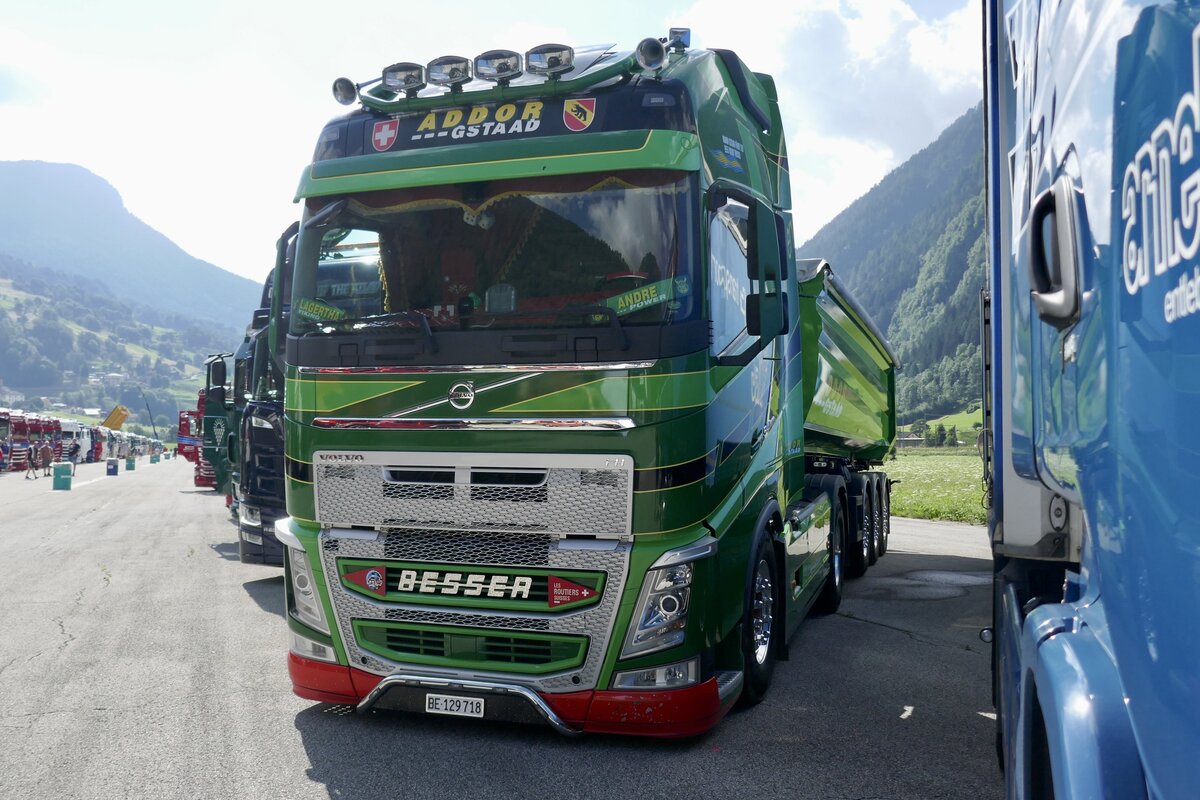VOLVO-FH500(globetrotter) mit Kippsattelauflieger vor einer Lagerhauseinfahrt; 240125