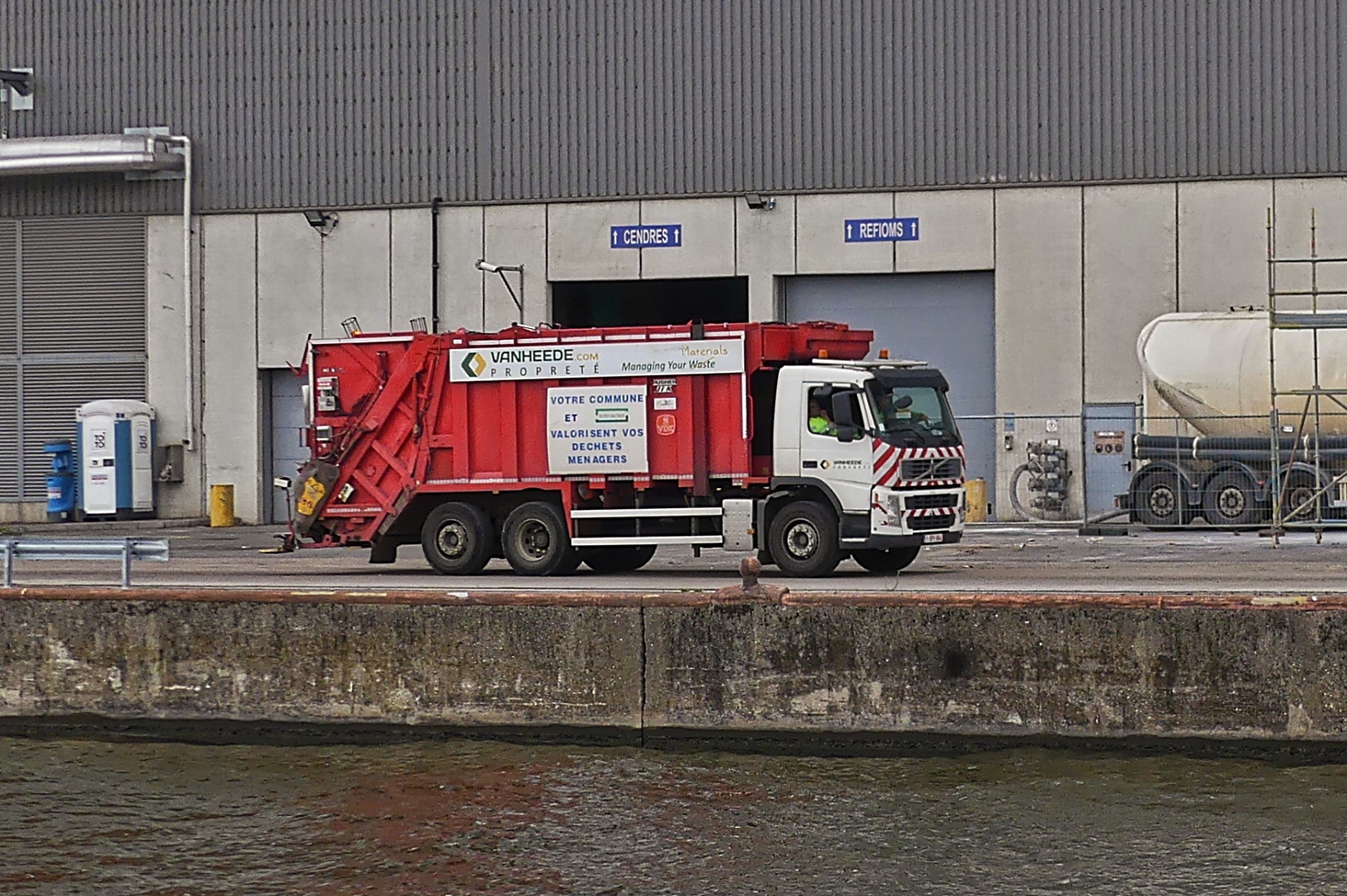 Volvo Müllentsorgungsfahrzeug, kommt bei der Müllverbrennungsanlage von Lüttich an. 09.2025