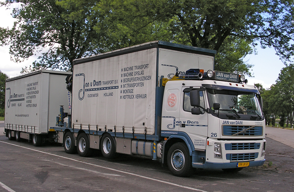 VOLVO - vermutlich "FM" 400 oder 440 - aus den Niederlanden... auf Maschinentransport spezialisierter Hängerzug..Rastplatzfoto vom 15.7.10