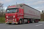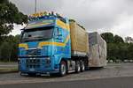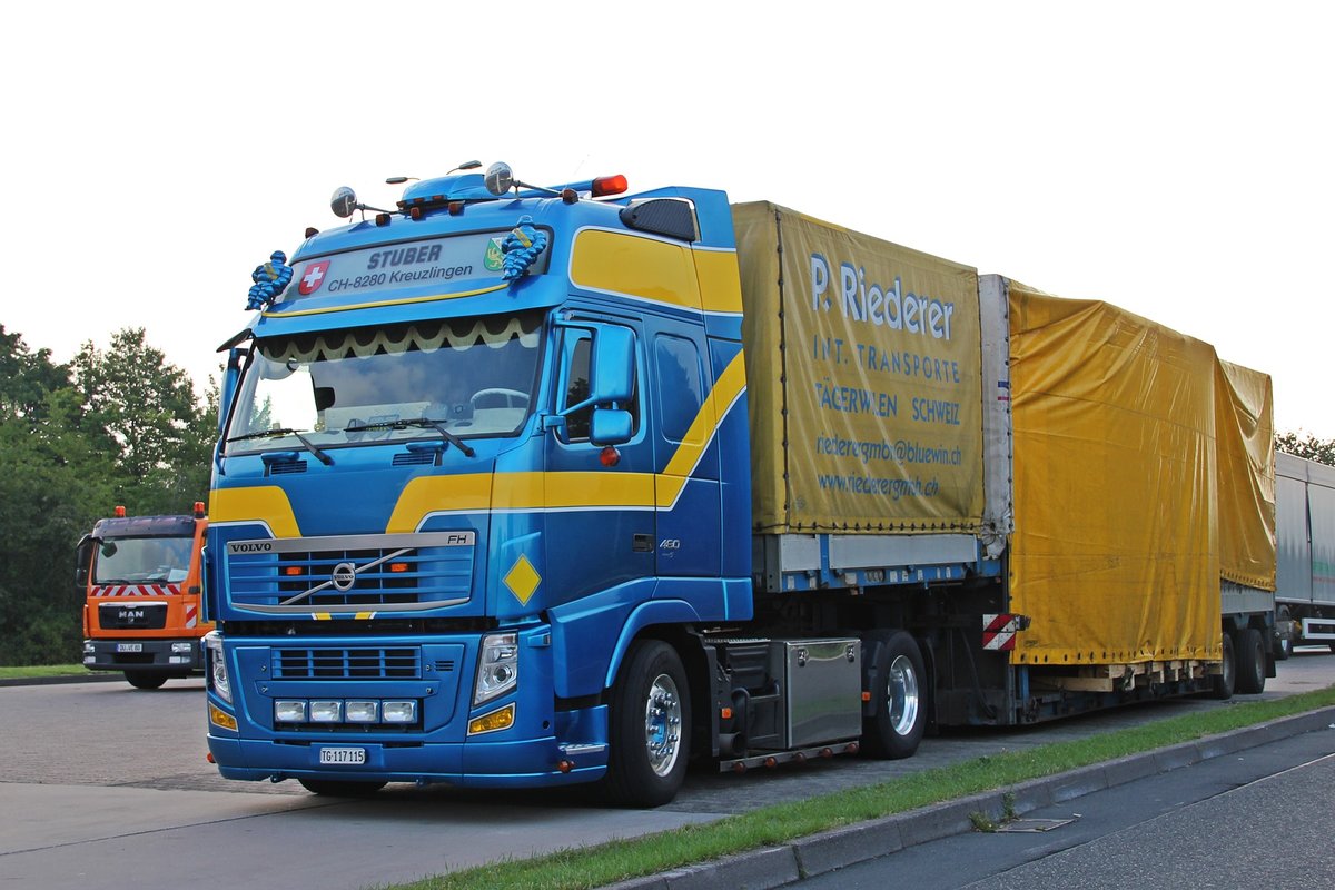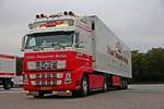 Volvo FH480 von Stuber aus der Schweiz mit Tieflader auf einem Parkplatz zwischen Zierenberg und Breuna A44.